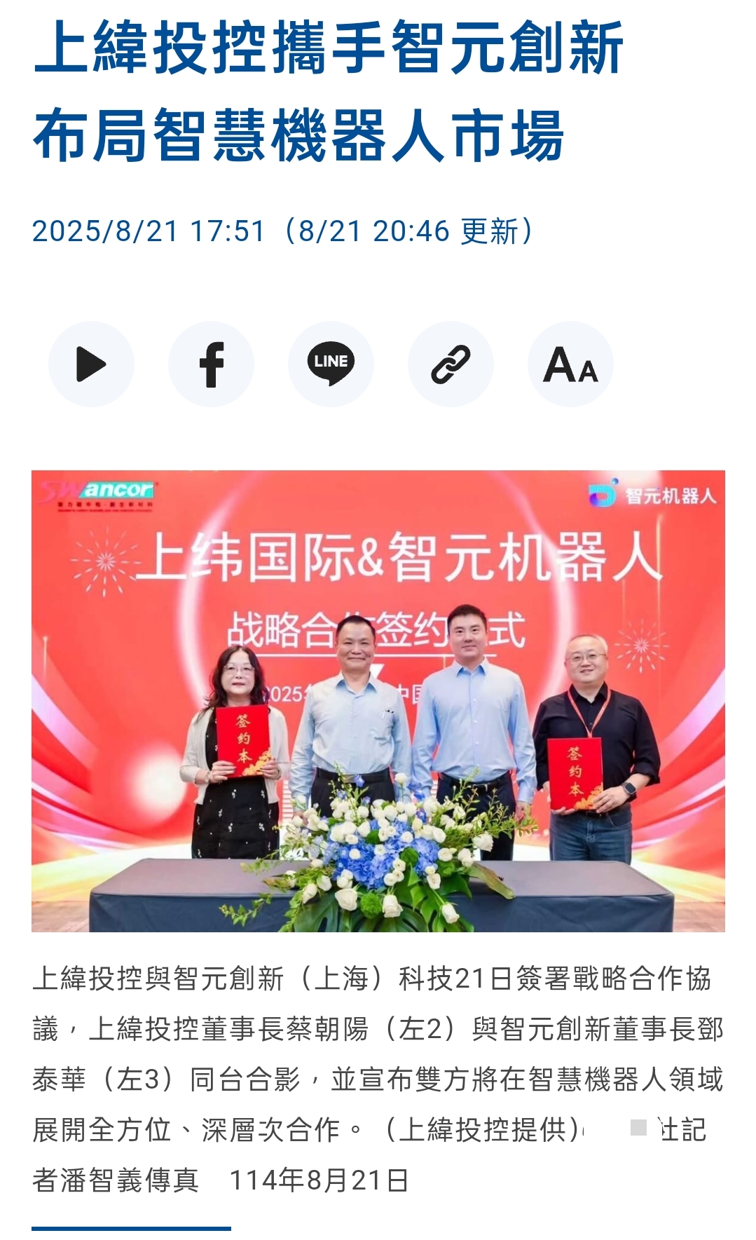 两位老大共同签署的战略合作协议(上纬投控官方发新闻稿,涉及上纬新材,但未在TW公告协议细节;智元官方和688585均未披露,坐实涉密),合作级别TOP。
