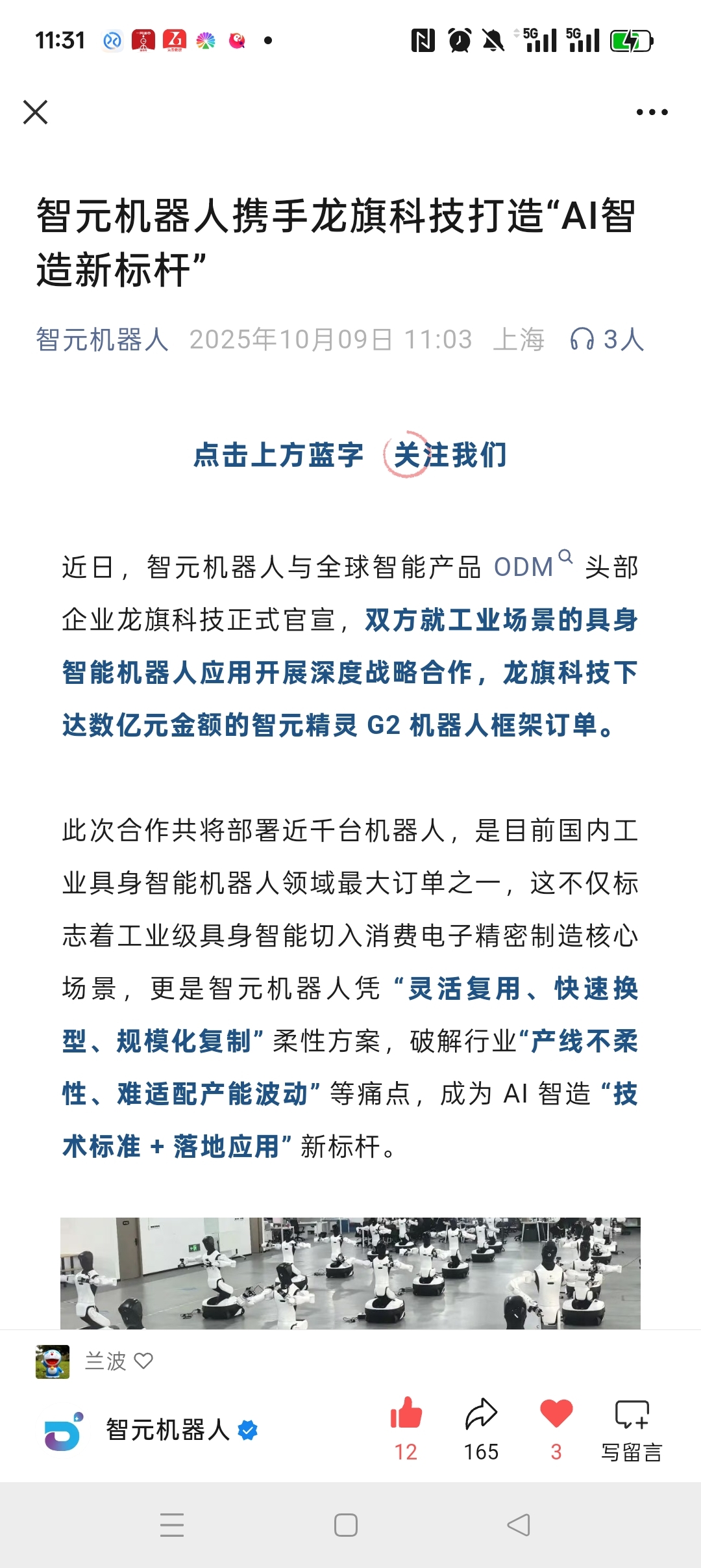 近日,智元机器人与全球智能产品 ODM 头部企业龙旗科技正式官宣,双方就工业场景的具身智能机器人应用开展深度战略合作,龙旗科技下达数亿元金额的智元精灵 G2 机器人框架订单。