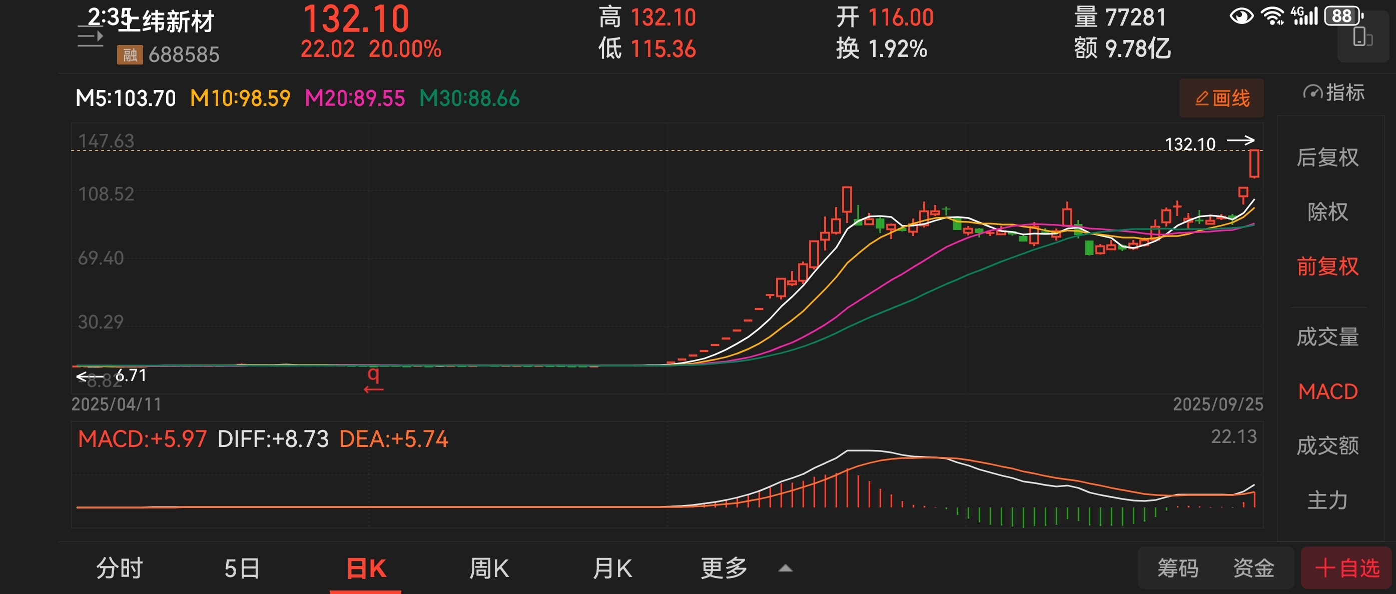 $上纬新材(SH688585)$ 休息日发个帖,上纬新材周一复盘,有点高,暂时别接!回调一下再说!切记