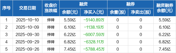 融资方面,当日融资买入0元,融资偿还5140.89万元,融资净偿还5140.89万元,连续6日净偿还累计2.51亿元。融券方面,融券卖出0股,融券偿还0股,融券余量0股,融券余额0元。融资融券余额合计5.59亿元。
