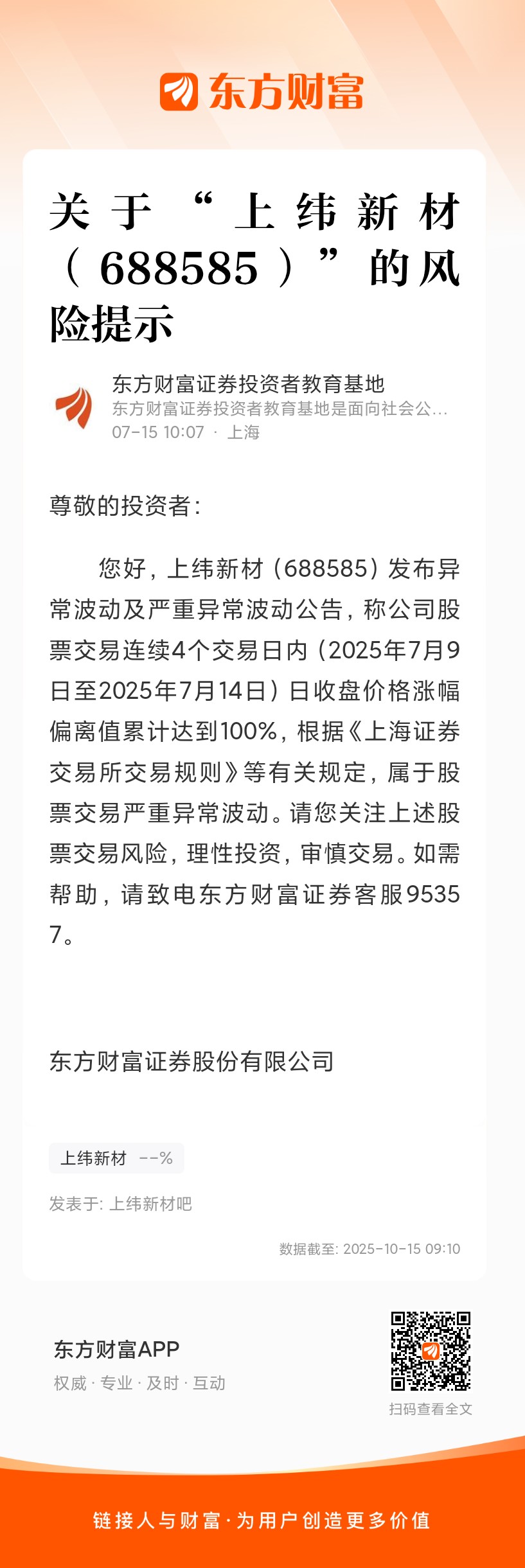 您好,上纬新材(688585)发布异常波动及严重异常波动公告,称公司股票交易连续4个交易日内(2025年7月9日至2025年7月14日)日收盘价格涨幅偏离值累计达到100%,根据《上海证券交易所交易规则》等有关规定,属于股票交易严重异常波动。请您关注上述股票交易风险,理性投资,审慎交易。如需帮助,请致电东方财富证券客服95357。