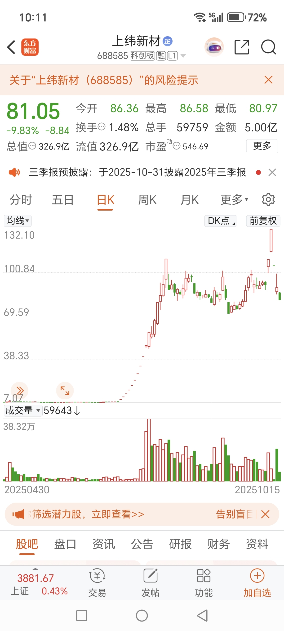 $上纬新材(SH688585)$ $上证指数(SH000001)$ 上纬新材连续大跌三天,我朋友问我能抄底了嘛?我不知该怎么回答他
