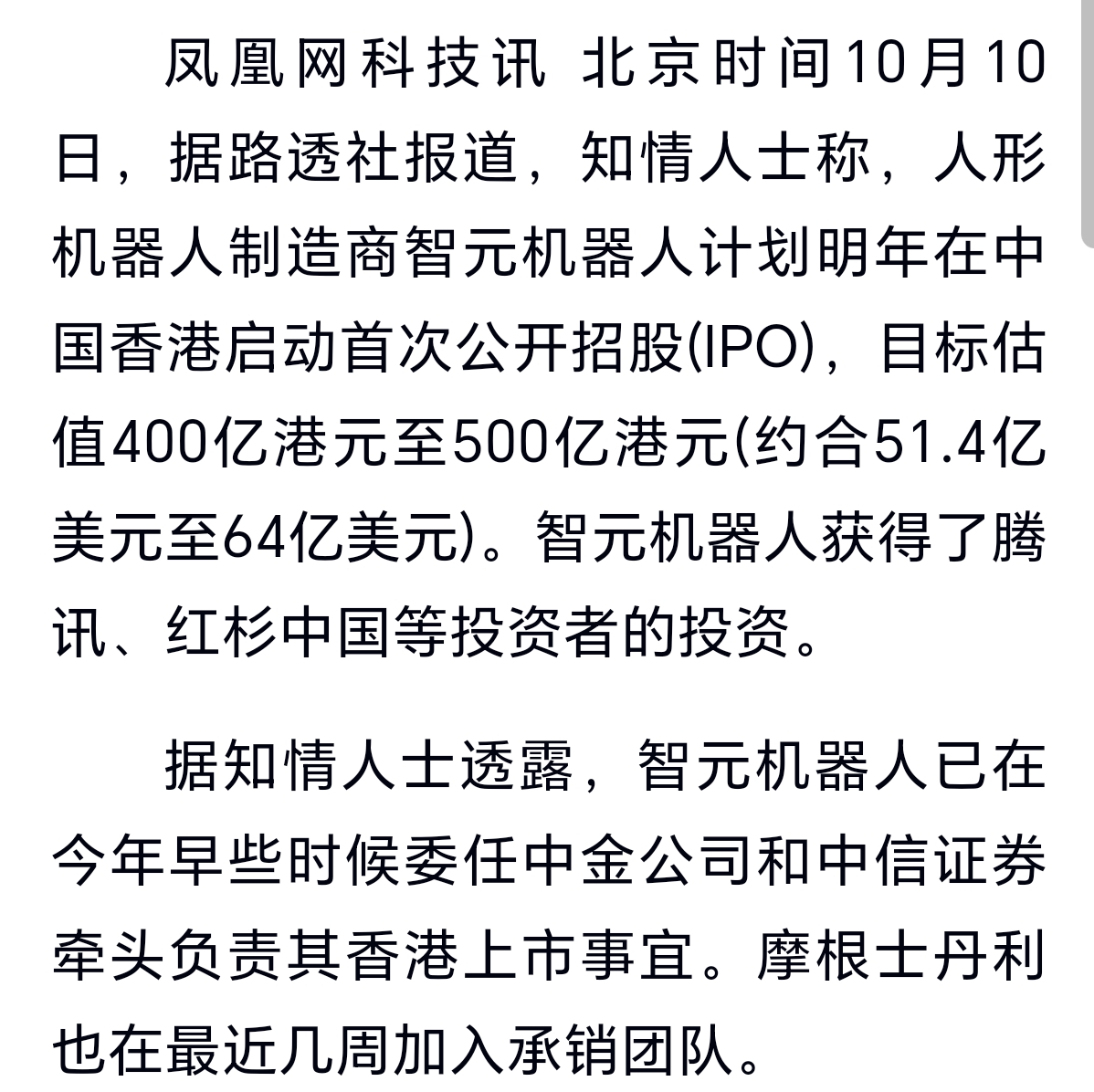 智元机器人已经计划香港IPO,承销券商为中金,中信,大摩,估值400亿到500亿