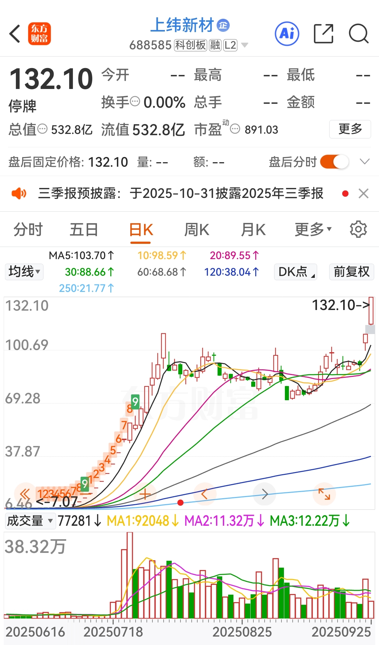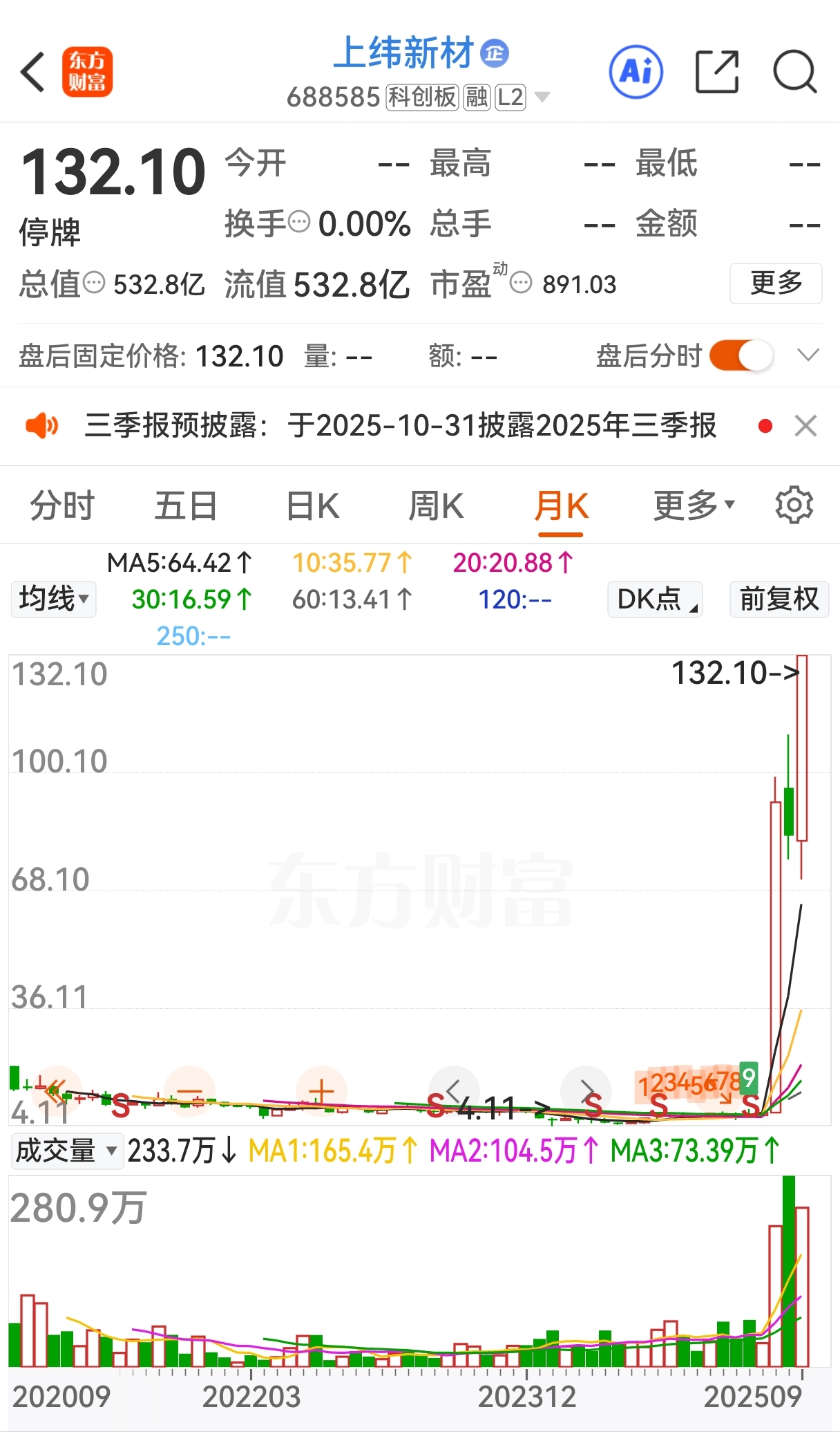 上纬新材今年的走势,堪称A股最刺激的过山车。从年初到停牌前,这只股票累计涨幅接近19倍,勇夺A股涨幅榜冠军。停牌前的最后一个交易日,它还来了个20厘米涨停,股价冲到132.1元,市值高达532亿元。这种疯狂表现,引来了交易所的特别关注。公司在7月9日至9月26日期间,股票交易8次触及异常波动,7次触及严重异常波动。