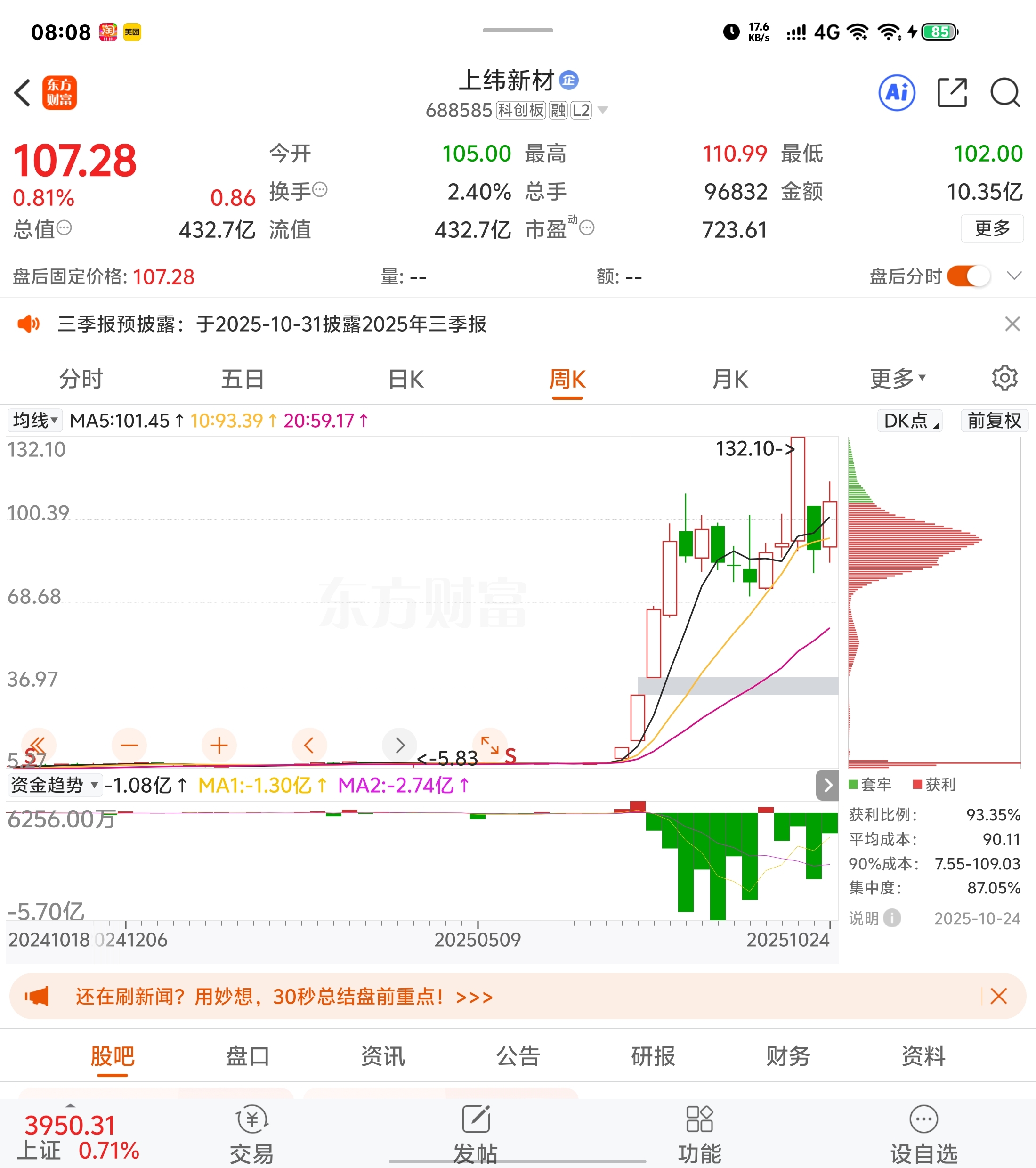 $上纬新材(SH688585)$ 本周注定是阳线,沿五周均线上升,不会低于105元!
