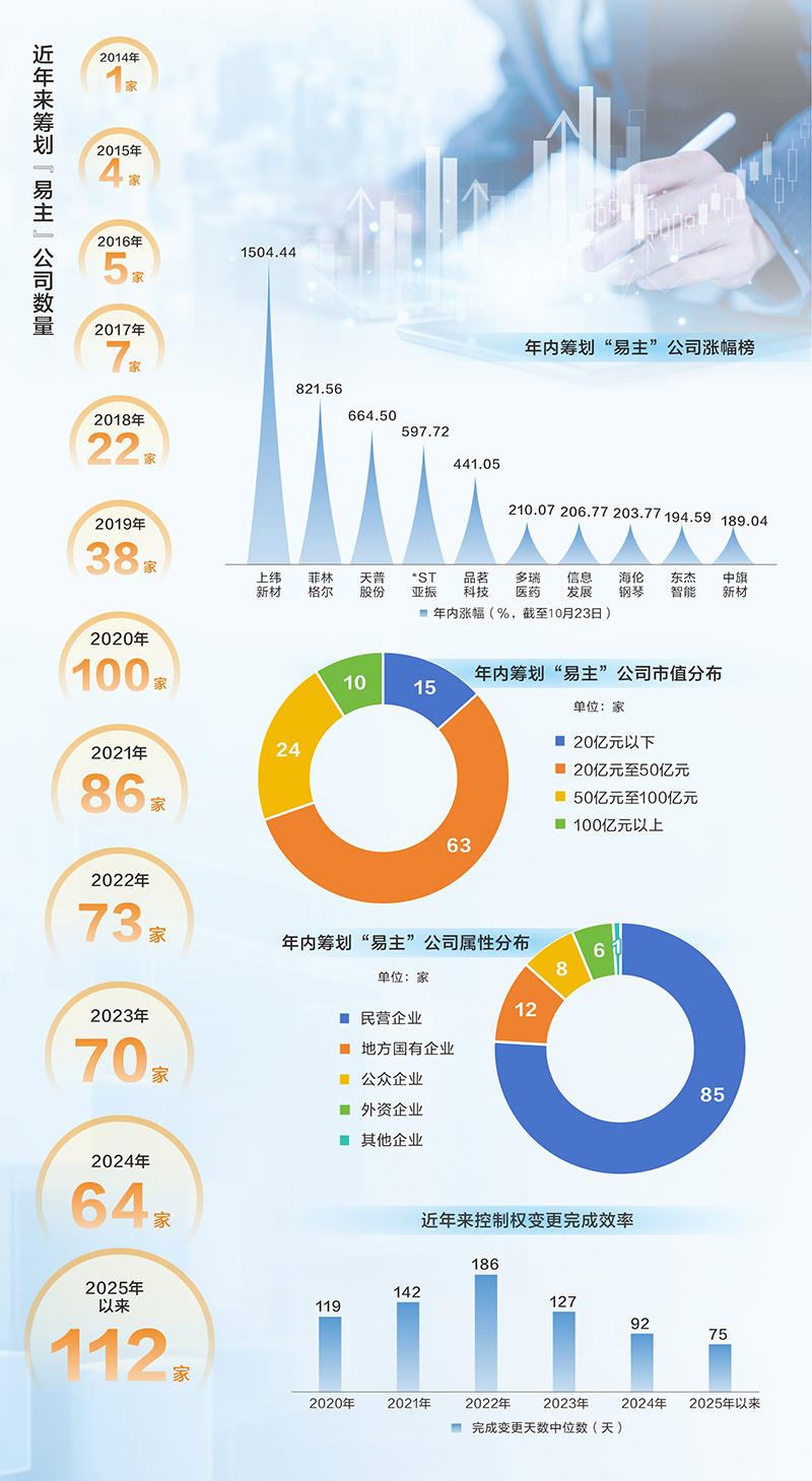 迈入2025年,A股市场便迅速迎来一波控制权变更的汹涌浪潮。据证券时报·数据宝统计,截至10月23日,通过筛选“筹划控制权变更”“控制权拟发生变更”等关键词的公告,发现112家上市公司有控制权易主事项,数量创下历年新高。回顾以往,2017年以前控制权易主的公司数量较少,2020年后开始大幅增长,2020年至2024年期间,数量均在60家以上,其中2020年达到100家。