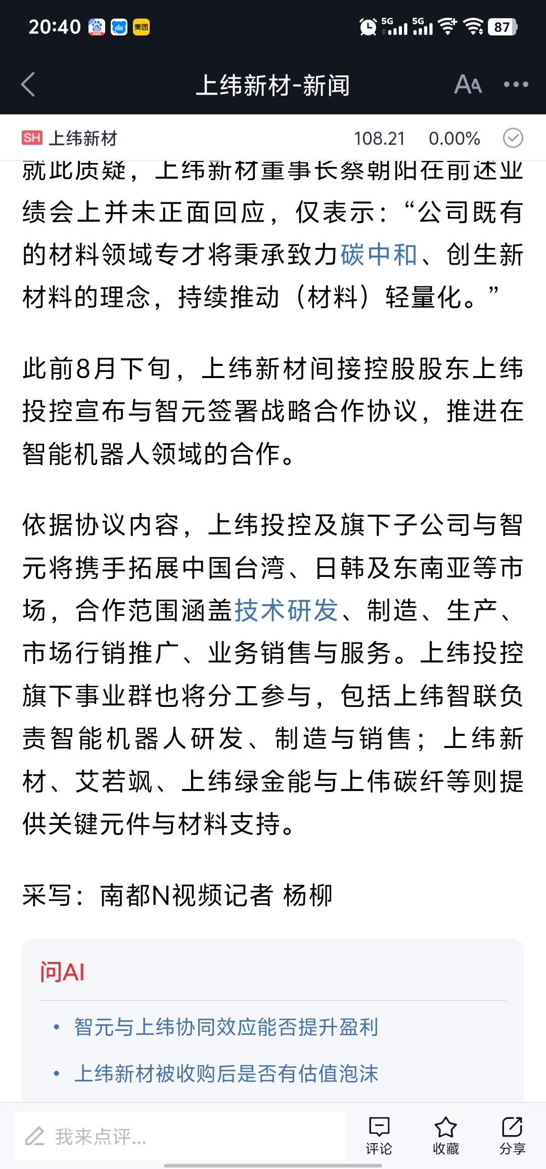 $上纬新材(SH688585)$ 依据协议内容,上纬投控及旗下子公司与智元将携手拓展中国台湾、日韩及东南亚等市场,合作范围涵盖技术研发、制造、生产、市场行销推广、业务销售与服务。上纬投控旗下事业群也将分工参与,包括上纬智联负责智能机器人研发、制造与销售;上纬新材、艾若飒、上纬绿金能与上伟碳纤等则提供关键元件与材料支持。