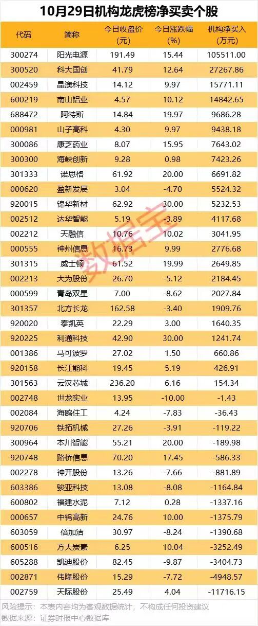 今日龙虎榜中,机构净买入的个股23只,净卖出的个股14只。阳光电源、科大国创、晶澳科技、南山铝业4股净买入金额分别为10.55亿元、2.73亿元、1.58亿元、1.48亿元;阿特斯、山子高科、康芝药业、海峡创新分别获净买入均超7000万元。