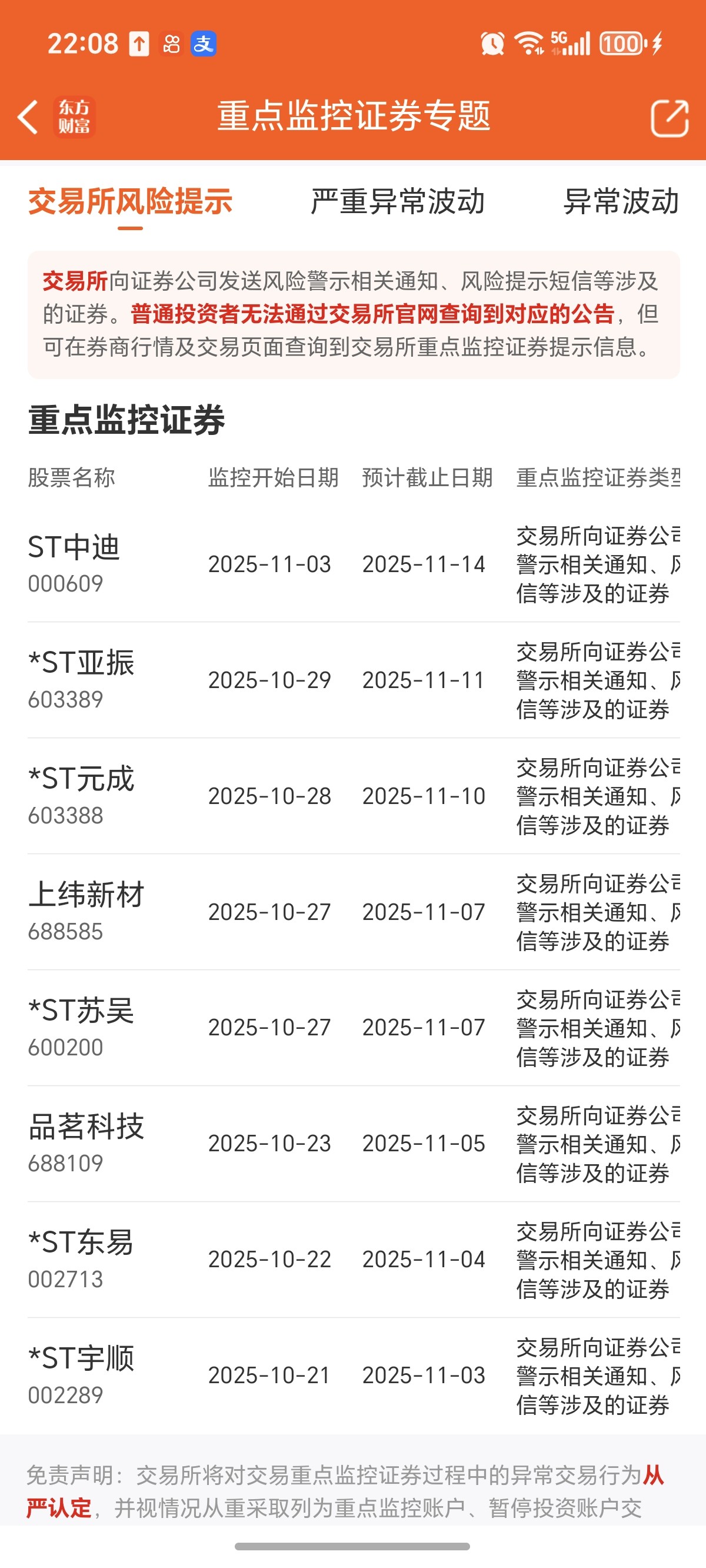 搜索中输入重点监控股票就出来异动和重点监控的票据,这个是10.27-11.07,