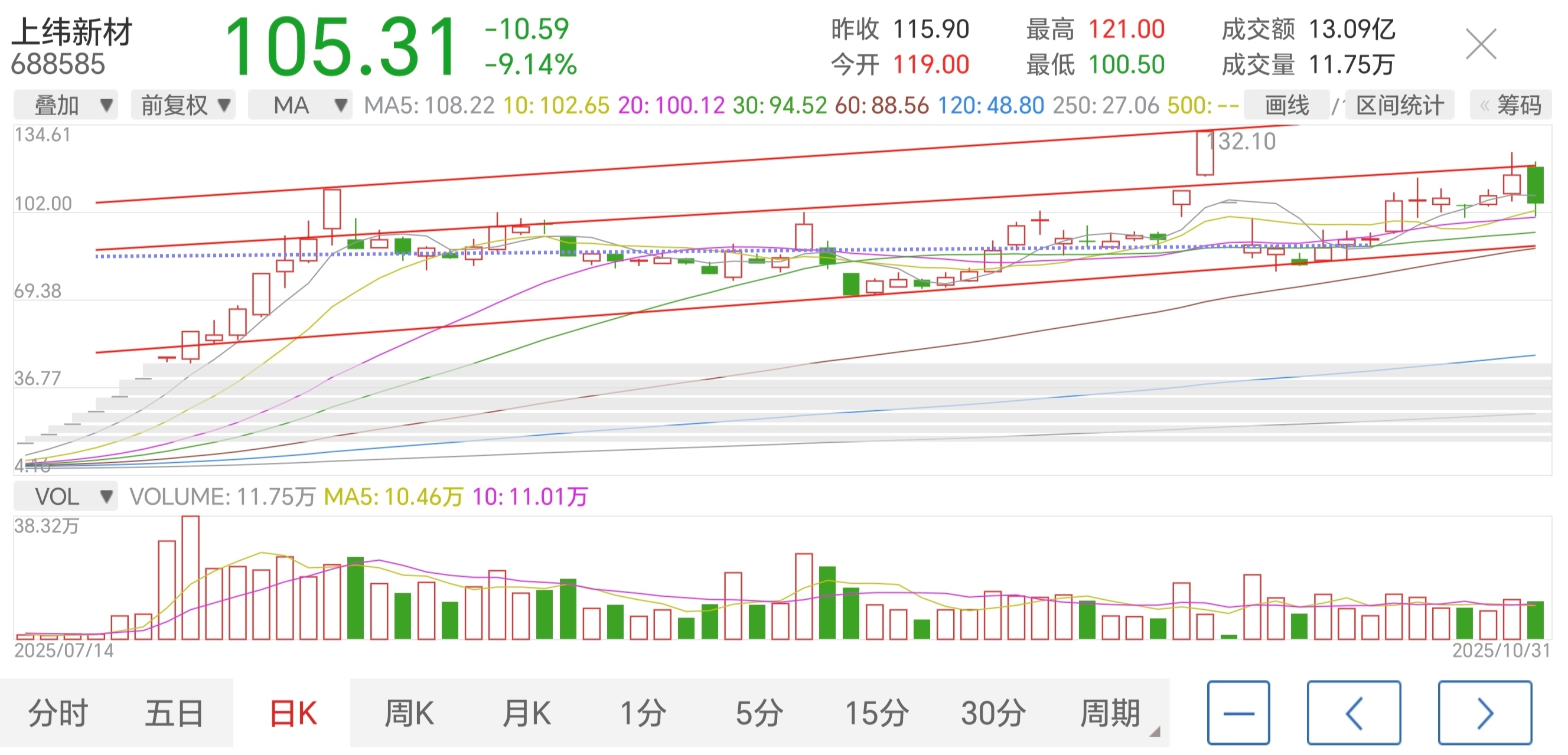 $上纬新材(SH688585)$ 上纬新材最近运行在上升通道中,有两条上轨线,一条大平台线,大平台价格90元左右。上周五下探到最近的小平台106元处试支撑力度,如果下周再接着下探,可到下轨位置的90元处考验支撑,同时也是前面构筑的大平台的位置。如果同是“大平台和下轨的90元”再破,那就得奔着前面两处低点的82元、71元去了,这是最坏的情况。试做此技术分析以求探讨,心里有数,到时不慌。