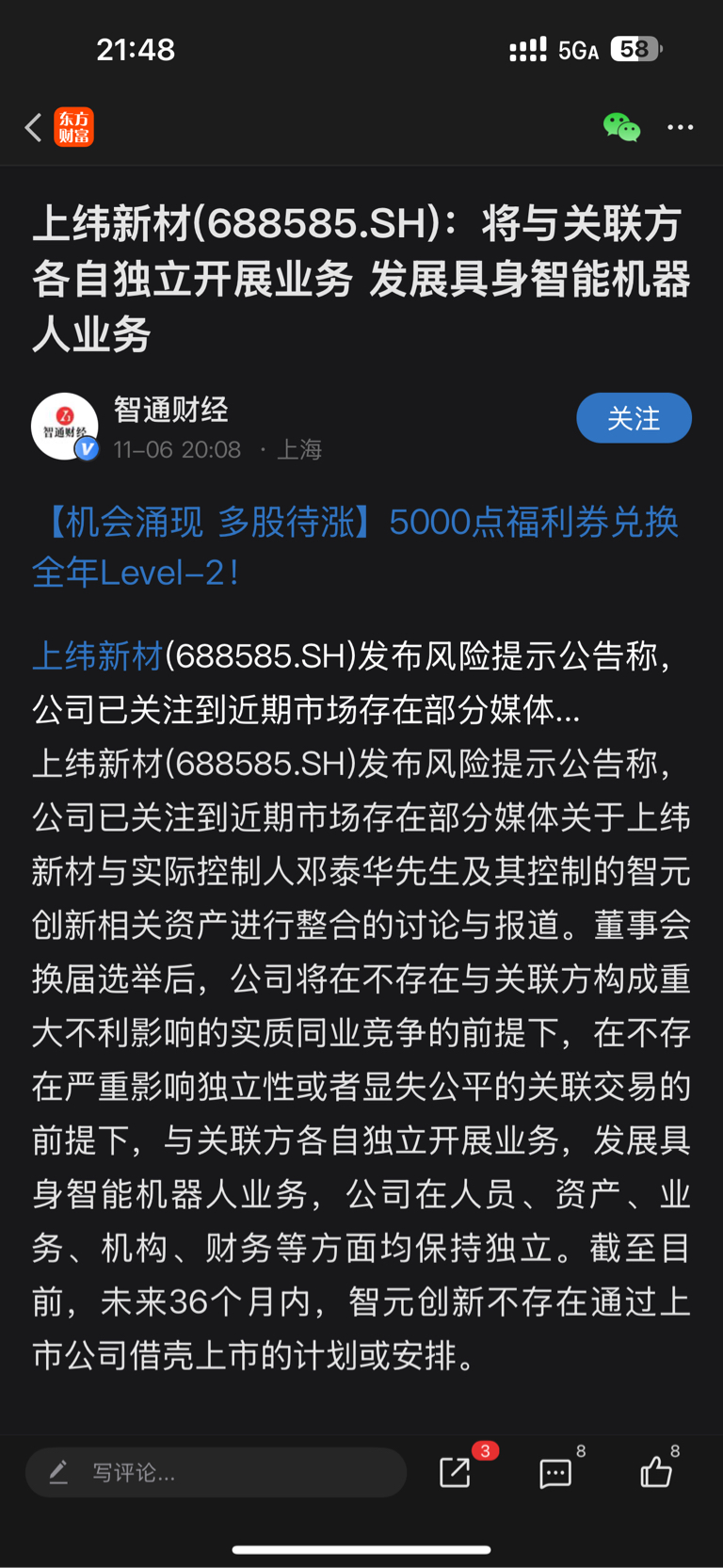 智元机器人重大利好,收购的上纬新材要独立发展机器人业务,收购股权已完成。最关键的