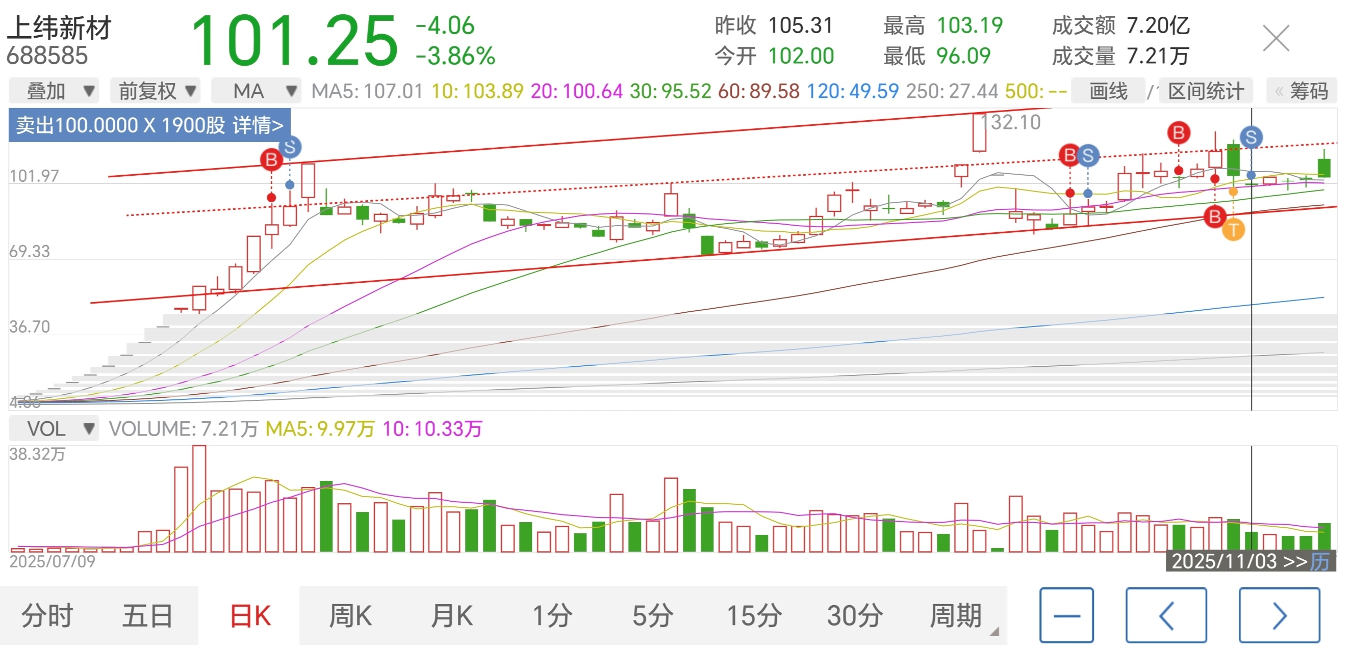 $上纬新材(SH688585)$ 我是前几天100割肉出的为了等90,出了反而就不继续跌了。 今天的下轨在92元左右,等跌到90看情况是否再接回来。