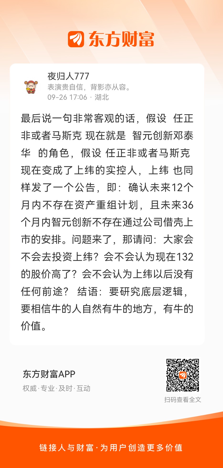 最后说一句非常客观的话,假设 任正非或者马斯克 现在就是 智元创新邓泰华 的角色,假设 任正非或者马斯克 现在变成了上纬的实控人,上纬 也同样发了一个公告,即:确认未来12个月内不存在资产重组计划,且未来36个月内智元创新不存在通过公司借壳上市的安排。问题来了,那请问:大家会不会去投资上纬?会不会认为现在132的股价高了?会不会认为上纬以后没有任何前途? 结语:要研究底层逻辑,要相信牛的人自然有牛的地方,有牛的价值。