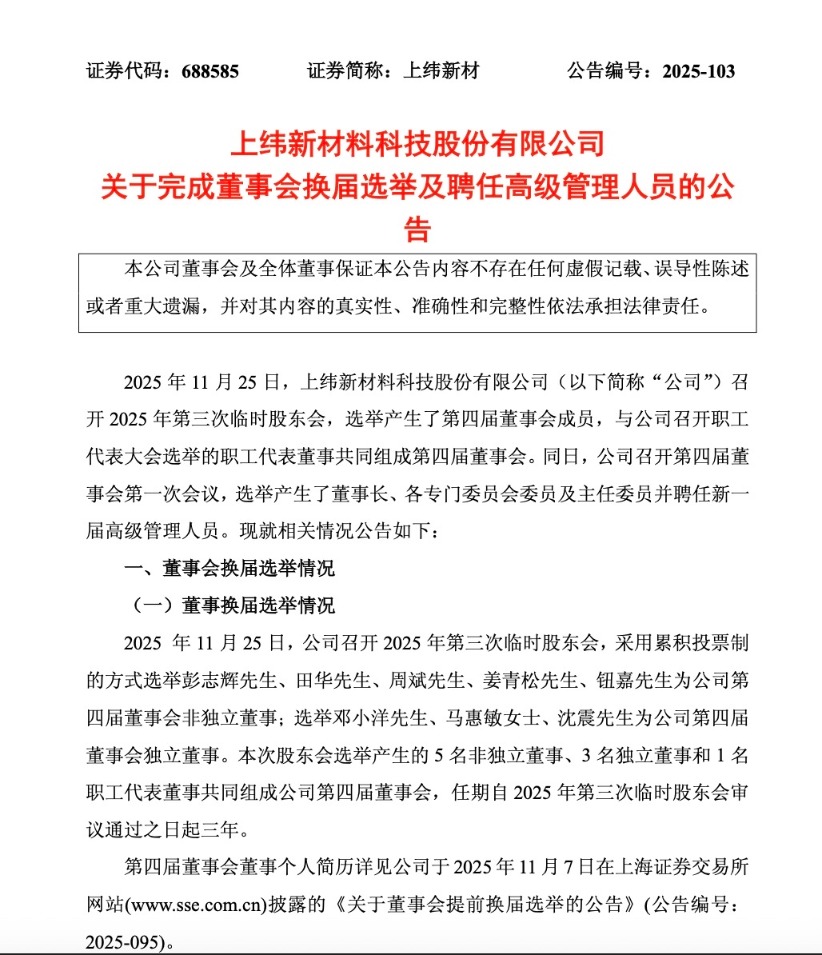 11月25日,上纬新材料科技股份有限公司(688585.SH)(以下简称“上纬新材”)召开了2025 年第三次临时股东会。根据公司公告披露,本次临时股东会通过累积投票制的方式选举了彭志辉、田华、周斌、姜青松、钮嘉为公司第四届董事会非独立董事。
