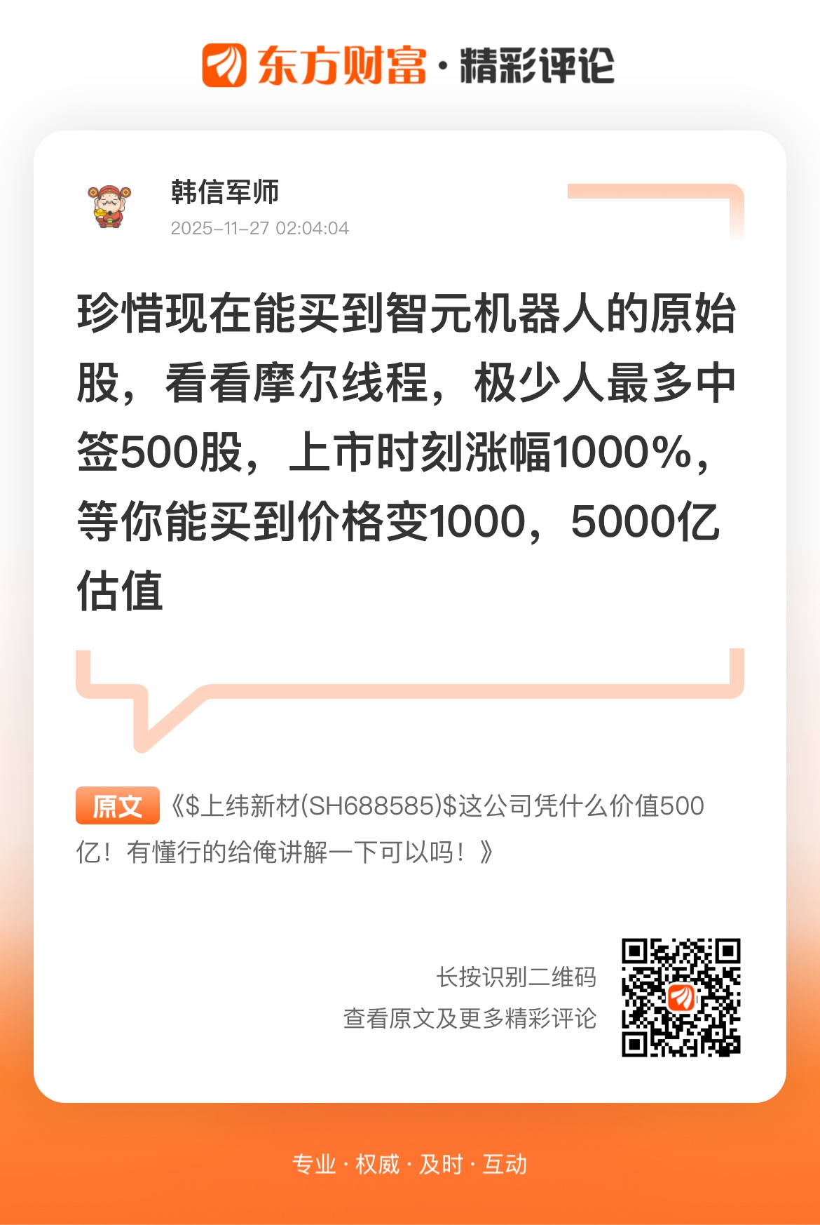 //@韩信军师 : 珍惜现在能买到智元机器人的原始股,看看摩尔线程,极少人最多中签500股,上市时刻涨幅1000%,等你能买到价格变1000,5000亿估值