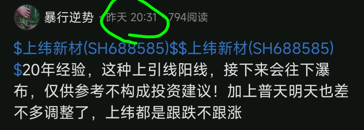$上纬新材(SH688585)$ 昨天晚上发的,很多人反对我,今天天普绿了。上纬也跌了,我说的对不对,下午跌幅会加大!