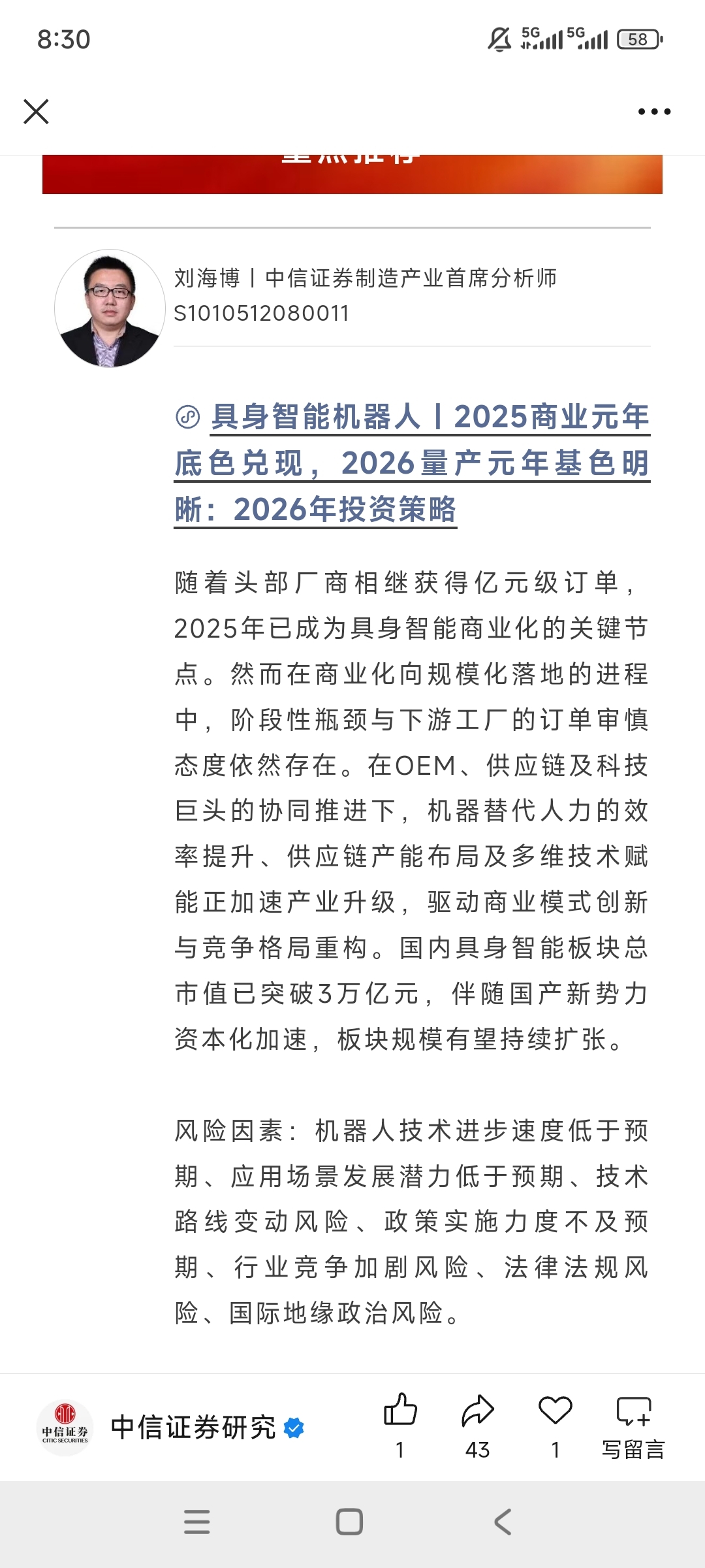 中信证券认为2026年机器人量产元年,智元上纬重大利好。