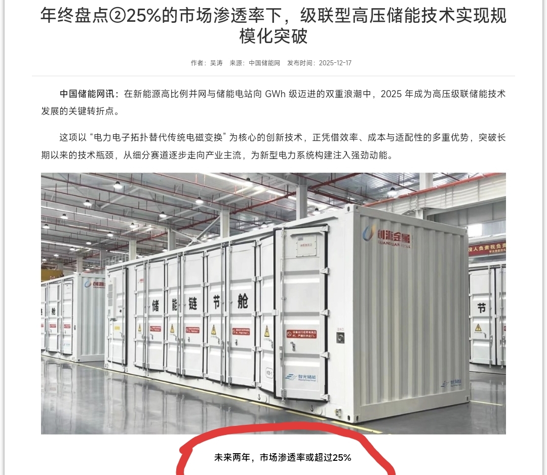 中国储能网表示:25年是高压级联型储能转折年,未来市场占有率将占有储能的25%。