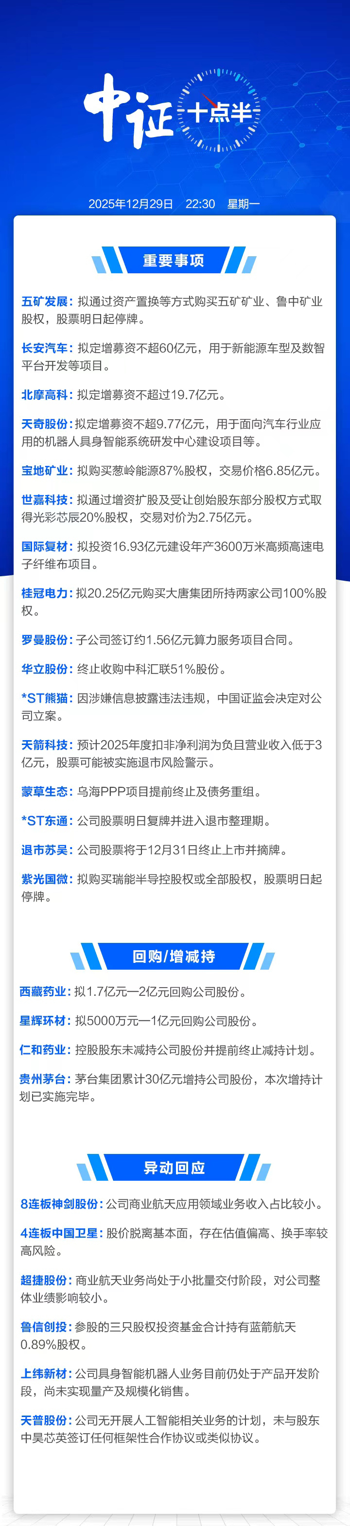 【中证十点半】上纬新材:具身智能机器人尚未实现量产;华立股份终止收购中科汇联股份;*ST熊猫被证监会立案