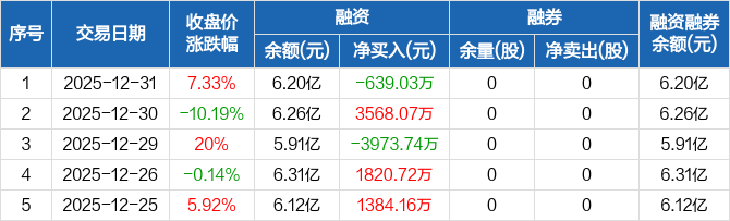 上纬新材:融资净偿还639.03万元,融资余额6.2亿元(12-31)