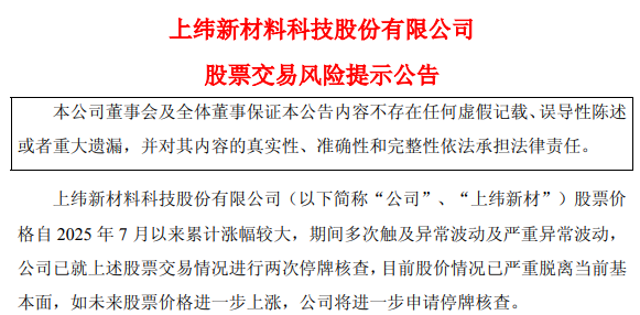 2025年年度涨幅王上纬新材今年继续涨势,公司发布交易风险提示。