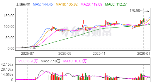 二级市场上,自2025年7月1日以来,上纬新材股价累计上涨近2000%,其间多次20%涨停。1月12日,上纬新材涨幅达11.19%,截至1月13日午间收盘,上纬新材再度上涨1.66%,股价创下历史新高,市值升至656.6亿元。