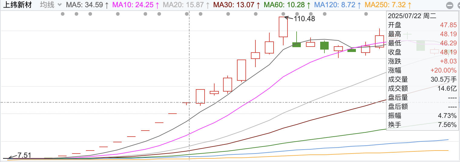 作为科创板上市公司,上纬新材每日涨跌幅限制为20%。上述消息一经公布,市场瞬间沸腾。2025年7月9日复牌首日,上纬新材一开盘就被巨量买单封死在20%的涨停板。2025年7月9日至7月22日,其股价连续10个交易日上演“20CM”一字涨停,从7.78元/股涨到48.19元/股,区间累计涨幅达519.41%。据其此前公告披露,公司股价自2025年7月9日至2025年12月31日累计上涨1537.15%。最新1月28日,上纬新材最终收跌3.72%,每股报144元。