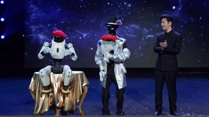 作为行业里程碑式的盛会,《机器人奇妙夜》实现了从“机器人演节目”到“机器人撑起一整台晚会”的质变。它成功打破了机器人仅限于单一任务执行的刻板印象,创下多个“从零到一”的突破:首个机器人小品、首个机器人魔术、首个人机共舞华尔兹等创举,集中展示了中国机器人在复杂运动控制、高精度群体协同和初步情感表达上的突破性进展,标志着其正式迈入“舞台级系统智能”新阶段。