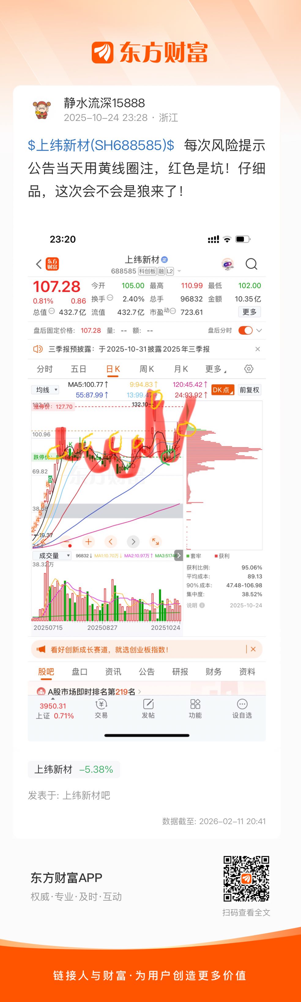 $上纬新材(SH688585)$  每次风险提示公告当天用黄线圈注,红色是坑!仔细品,这次会不会是狼来了!