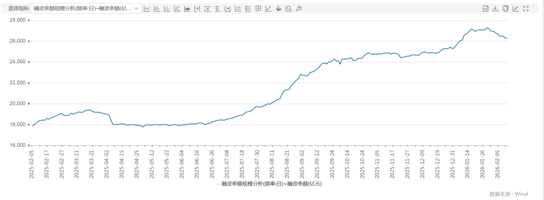 Wind数据显示,截至2月12日,A股两融余额报26456.02亿元,融资余额报26293.37亿元,蛇年以来融资余额增加8640亿元。在蛇年,两融余额和融资余额均连创新高,A股两融余额一度站上2.73万亿元。