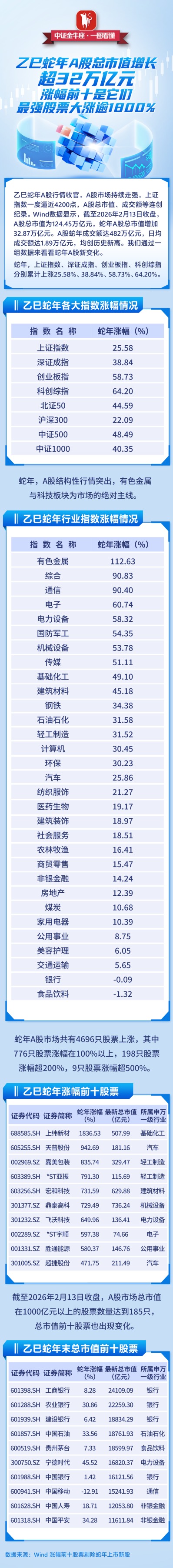 【一图看懂】乙巳蛇年A股总市值增长超32万亿元,最强股票大涨逾1800%