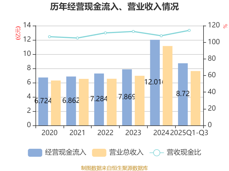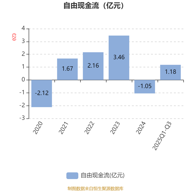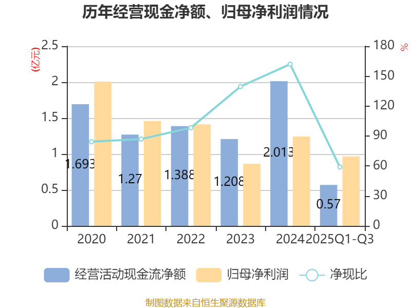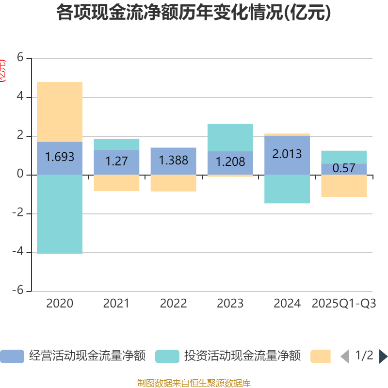 2025年前三季度,公司经营活动现金流净额为5700.14万元,同比下降55.6%;筹资活动现金流净额-1.15亿元,同比减少1.73亿元;投资活动现金流净额6624.3万元,上年同期为-1.6亿元。