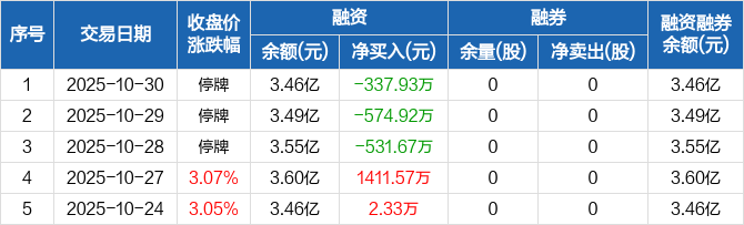 融资方面,当日融资买入0元,融资偿还337.93万元,融资净偿还337.93万元,连续3日净偿还累计1444.51万元。融券方面,融券卖出0股,融券偿还0股,融券余量0股,融券余额0元。融资融券余额合计3.46亿元。