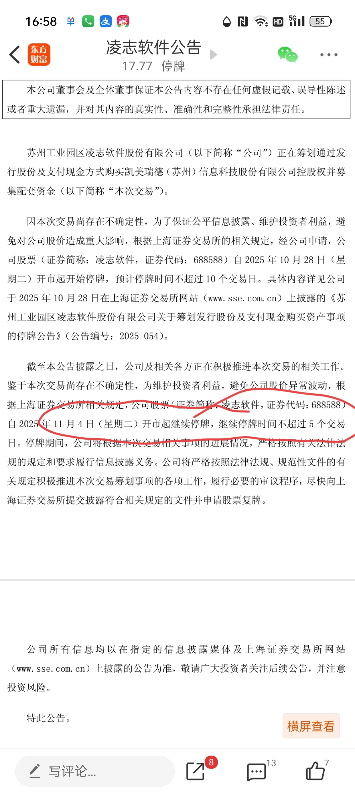 $凌志软件(SH688588)$ 从字面上:"11月4号起,不超过5天,即最多4天"应该下周一开盘,南无阿弥陀佛!