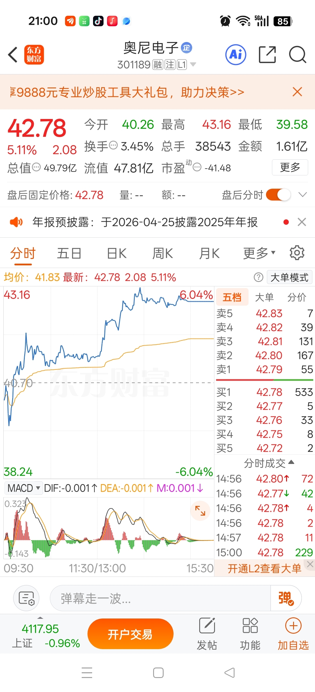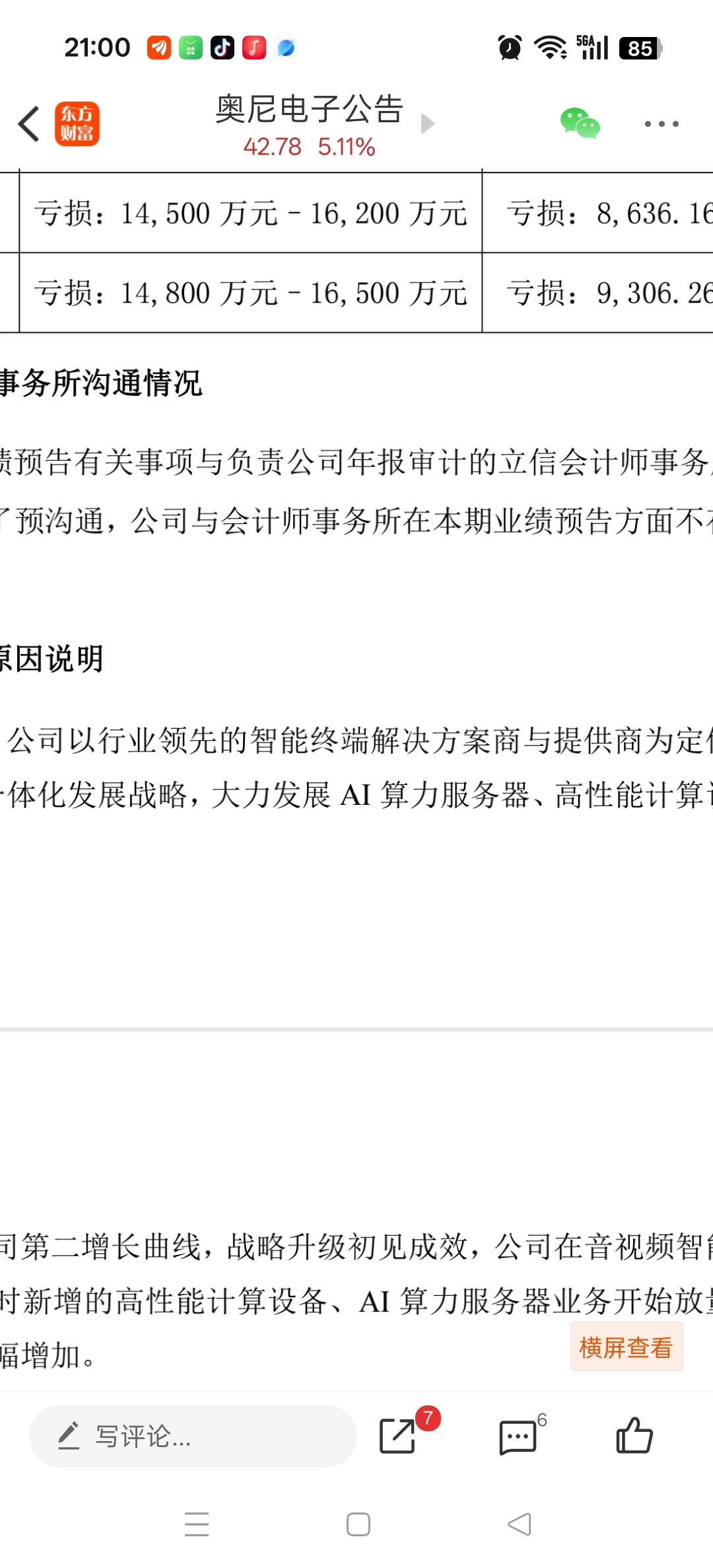 奥尼电子年报亏损一个亿,今天还涨五个多点。