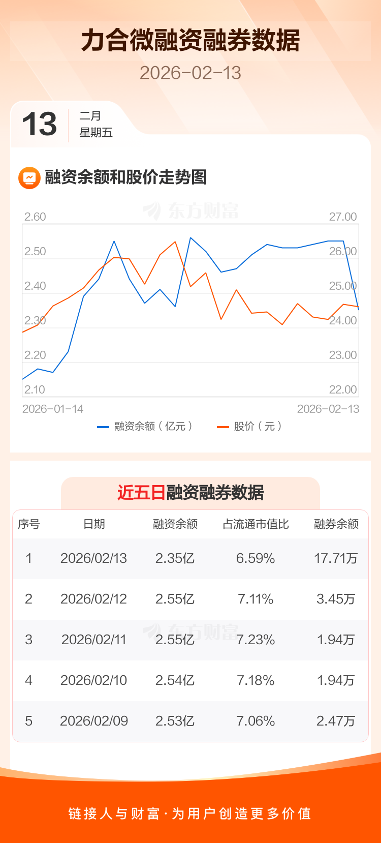 交易所最新数据显示,力合微于2026年2月13日获融资买入1150.86万元,融资偿还3083.82万元,当日融资净偿还1932.96万元。目前,该股融资余额2.35亿,占流通市值比例为6.59%。
