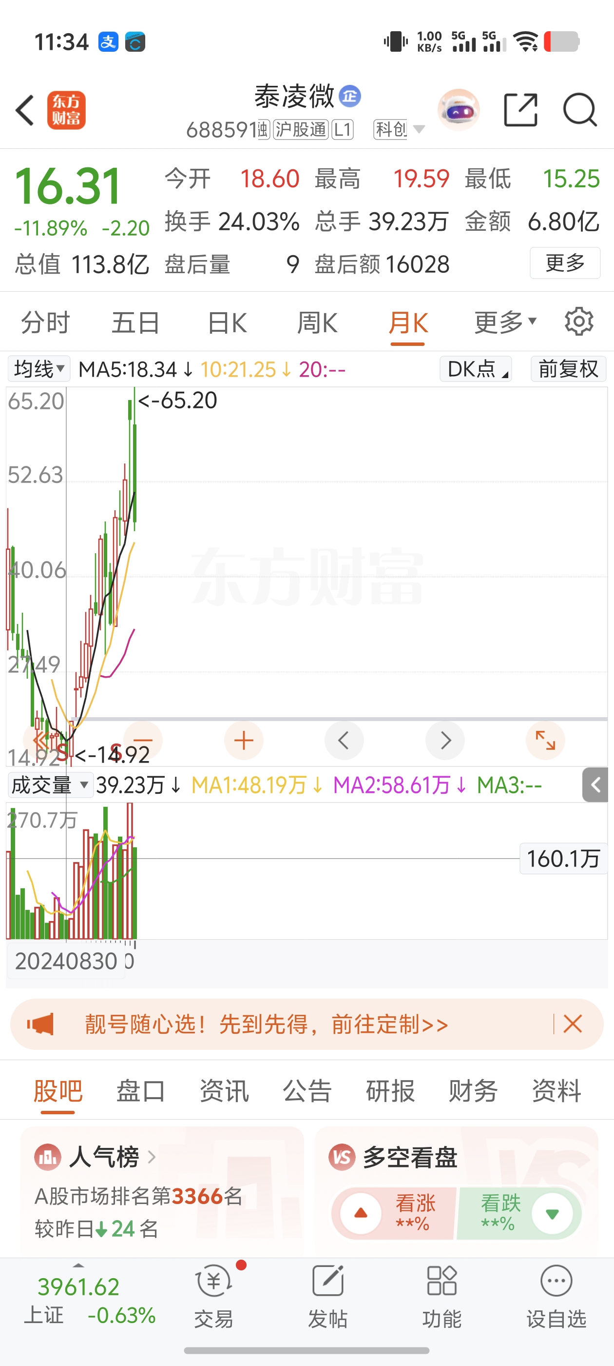 $泰凌微(SH688591)$ 从14块多涨到六十多,回调个30块钱怎么了,我觉得王总人好还不错。人上市就是圈钱的,有哪家上市是为了救济散户的?