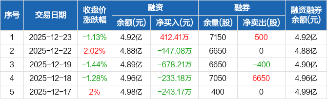泰凌微:融资净买入412.41万元,融资余额4.92亿元(12-23)