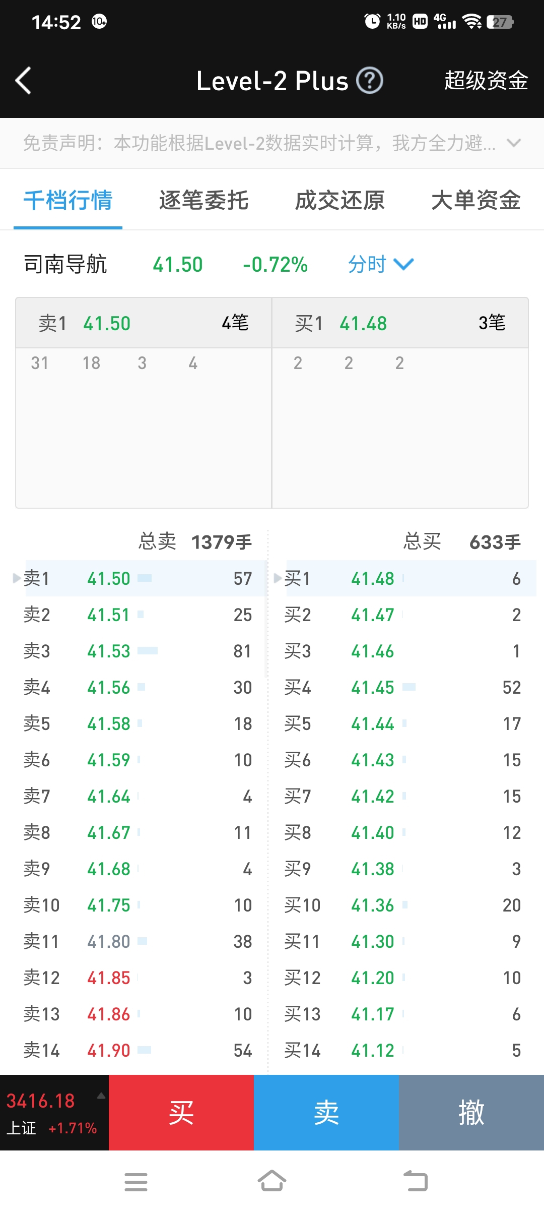 $司南导航(SH688592)$ 昨天收盘集合竞价强行拉高了二毛多,实际上也就是41.6左右,现在已经在昨天收盘价上纠结!盘口控制能力强,不出黑天鹅事件,现在分批买入,价格是很安全!