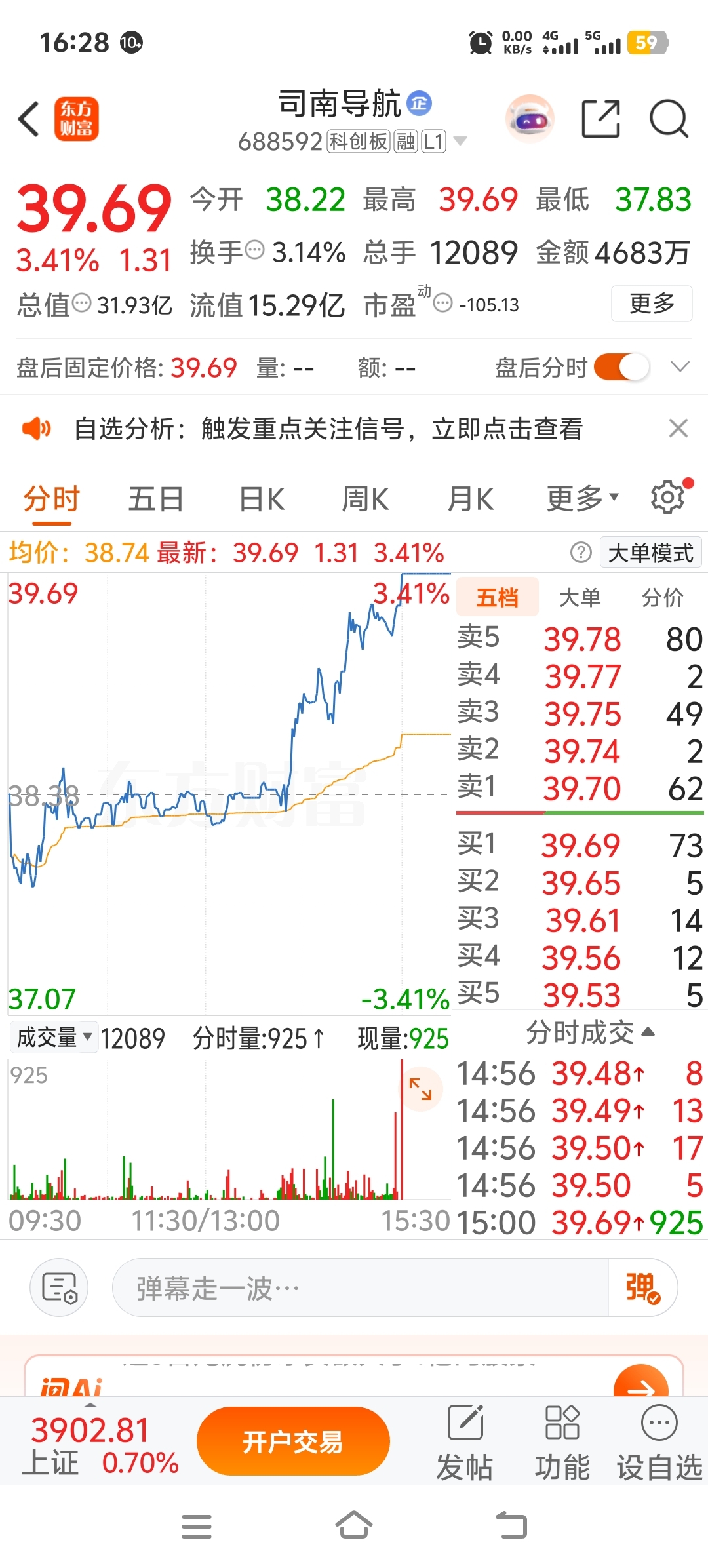 $司南导航(SH688592)$ 这分时图和涨停封板一个样