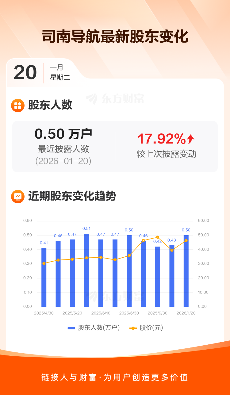 司南导航:截至1月20日最新股东户数5034户,较上期增加17.92%