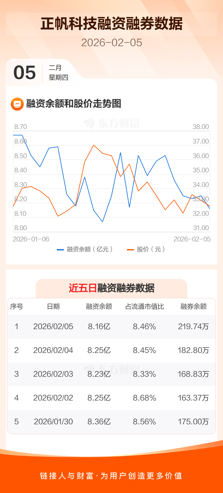 交易所最新数据显示,正帆科技于2026年2月5日获融资买入2456.01万元,融资偿还3421.37万元,当日融资净偿还965.35万元。目前,该股融资余额8.16亿,占流通市值比例为8.46%。