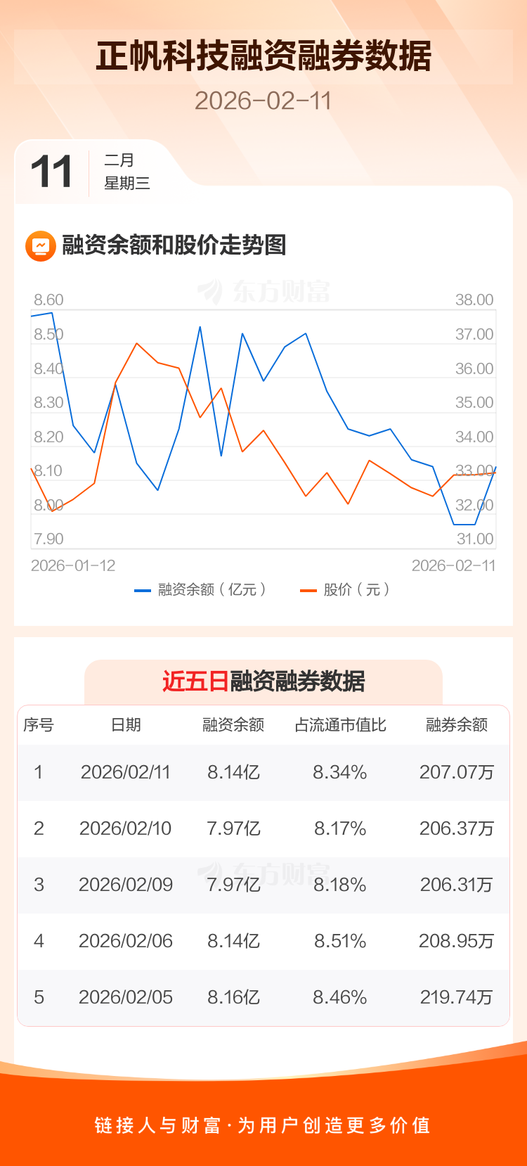 交易所最新数据显示,正帆科技于2026年2月11日获融资买入3946.00万元,融资偿还2183.84万元,当日融资净买入1762.16万元。目前,该股融资余额8.14亿,占流通市值比例为8.34%。