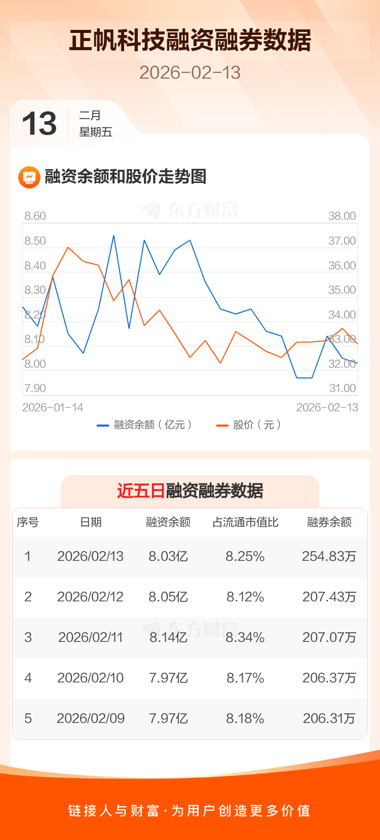 交易所最新数据显示,正帆科技于2026年2月13日获融资买入3080.85万元,融资偿还3344.16万元,当日融资净偿还263.31万元。目前,该股融资余额8.03亿,占流通市值比例为8.25%。