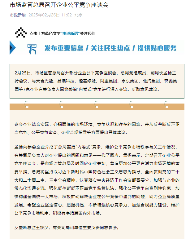2月26日,国家市场监督管理总局官方微信公众号“市说新语”发文,2月25日,国家市场监督管理总局召开部分企业公平竞争座谈会,总局党组成员、副局长孟扬主持会议,与天合光能、晶澳科技、隆基绿能、阿里集团、京东集团、北汽集团、奔驰集团等7家企业有关负责人围绕整治“内卷式”竞争进行深入交流,听取意见建议。