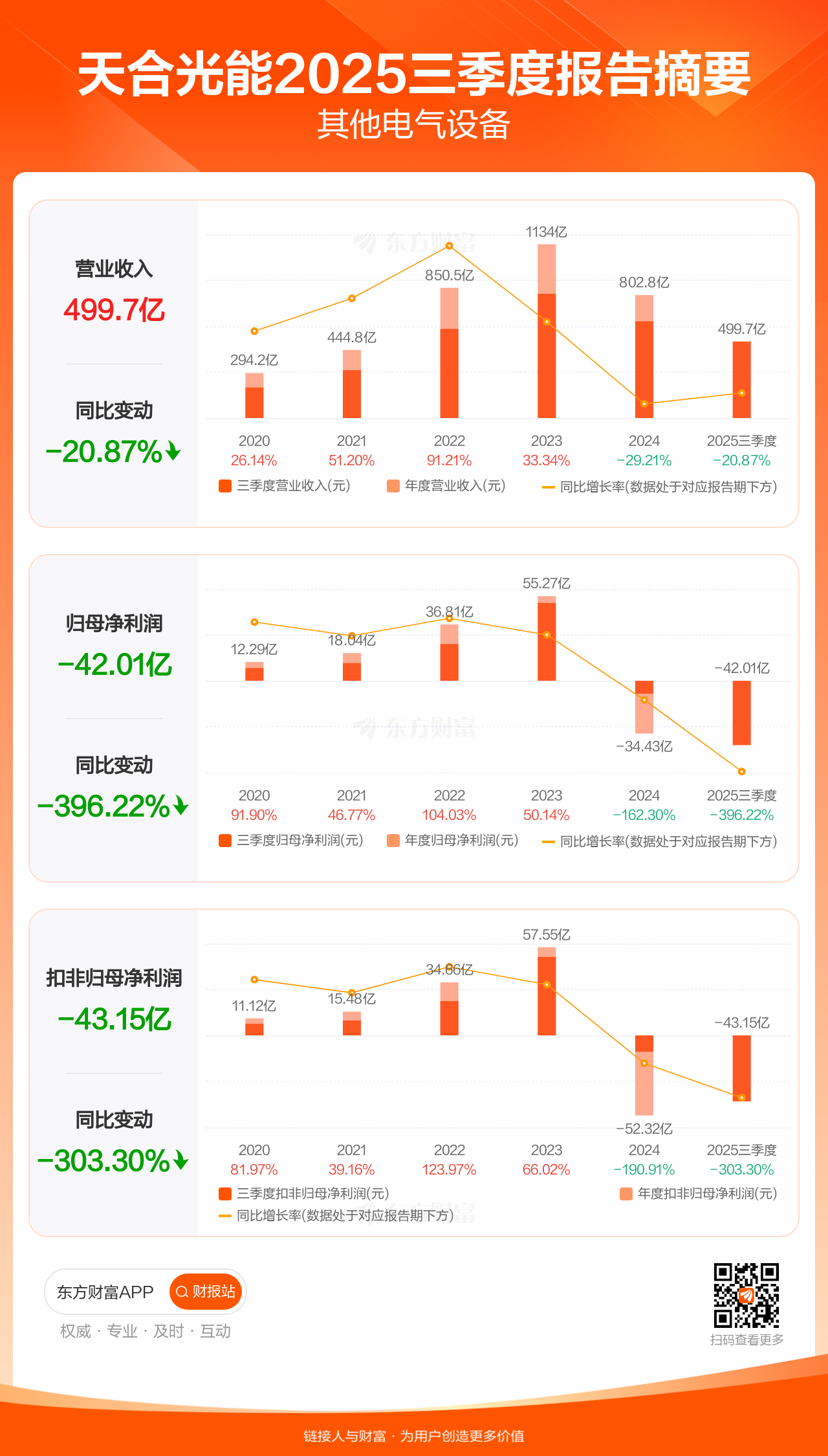 天合光能10月31日发布2025年三季报显示,公司前三季实现营业收入499.70亿元,同比下滑20.87%;归母净利润-42.01亿元;扣非归母净利润-43.15亿元。