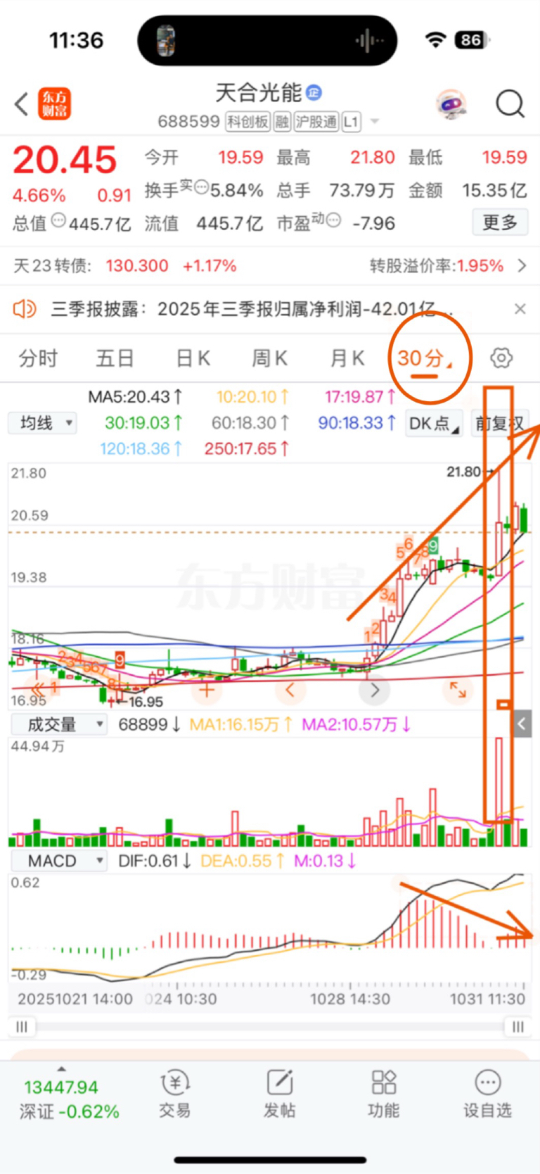 $天合光能(SH688599)$ 开盘半小时主力浮动仓已经部分出逃,套了一批追高的小散,业绩亏损挺多主力不会去快速拉的,没有业绩机构资金也不会来的,主力现在拉高就是为小散作嫁衣;技术图形很明显了,MACD30分钟顶背离,股价偏离度较大,需要等30天线上来才会继续上涨,所以今天追高的要么明天赶紧跑,或者今天有底仓的最好跑一部分出去,等上方筹码割肉再买回来,毕竟业绩亏损收窄,未来还是会涨的。