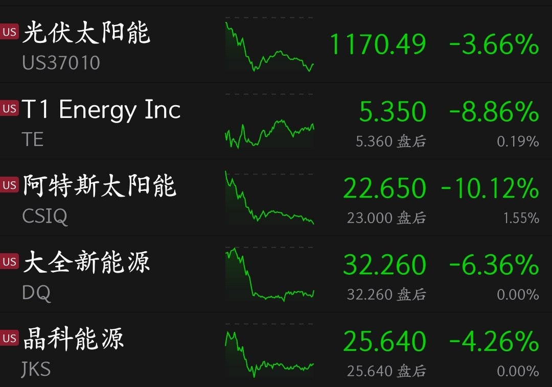 $天合光能(SH688599)$ 芭比扣了,周一大概率要大幅低开又要开始大跌了,美股太阳能板块,T1 energy inc暴跌,阿特斯太阳能,大全新能源,晶科能源暴跌。尾盘异动跟着抄底抄了一手