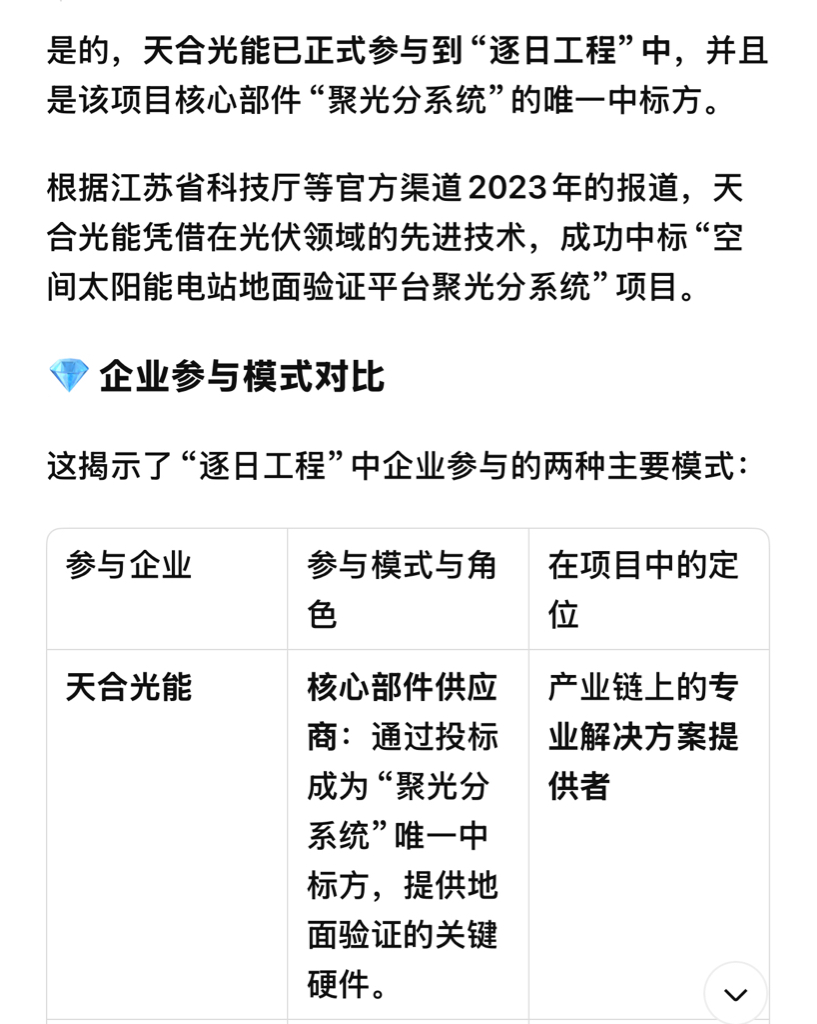 $天合光能(SH688599)$ 国家的逐日工程(国家太阳能空间电站项目,目前国家已经投了180亿)。特别提示: 虽然隆基绿能、东方日升等也在研发太空光伏技术(如钙钛矿叠层),但在国家“逐日工程”的核心立项与工程落地层面,目前中国核建承担着基础设施建设的重任,而天合光能和乾照光电则在光电转换环节走在前列。奇怪天合是最正宗的太空光伏,走势比较弱哟。