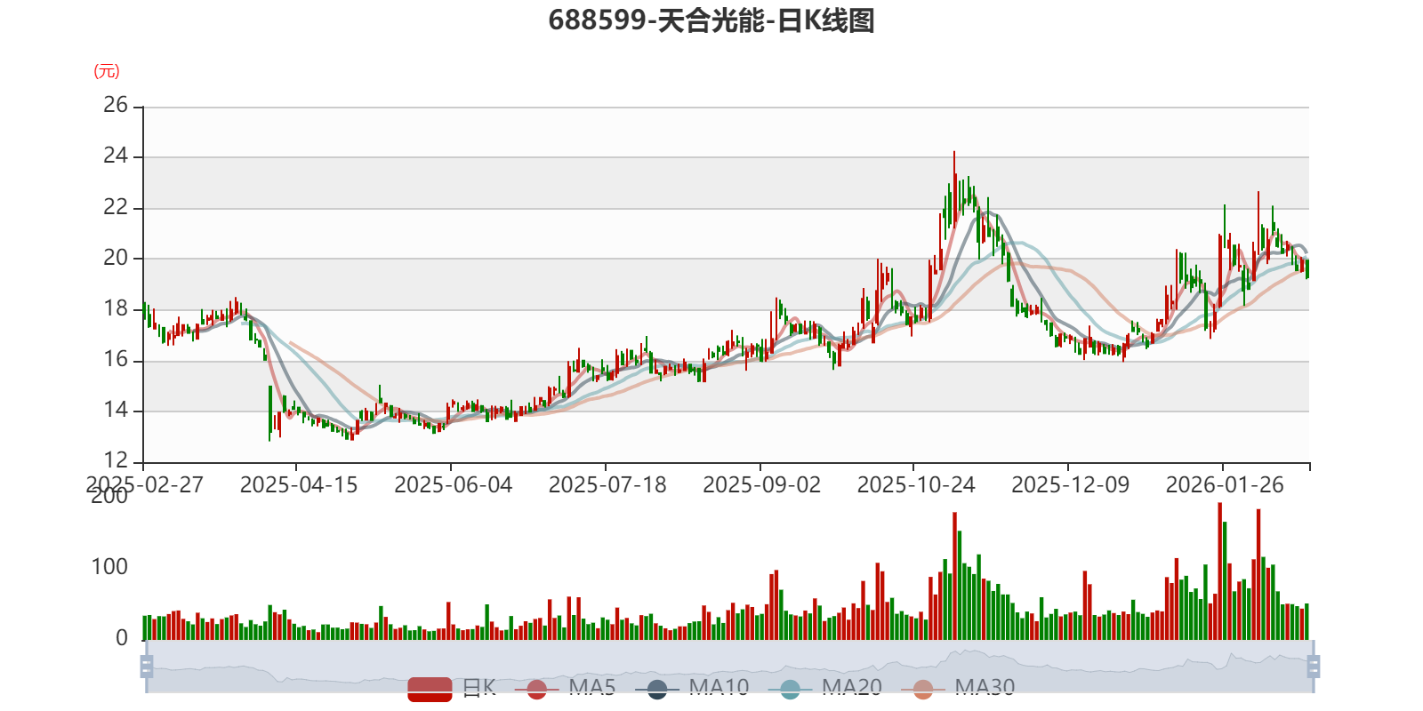 中证智能财讯天合光能(688599)2月26日晚间披露2025年业绩快报,公司实现营业收入672.79亿元,同比下降16.2%;归母净利润亏损69.94亿元,上年同期亏损34.43亿元;扣非净利润亏损74.21亿元,上年同期亏损52.32亿元;基本每股收益-3.23元,加权平均净资产收益率为-30.46%。以最新收盘价计算,市净率(LF)约2.13倍,市销率(TTM)约0.67倍。